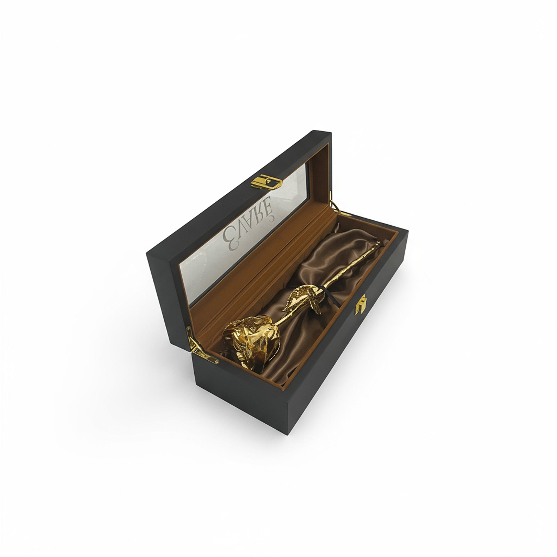 This 24K gold–dipped natural rose rests in a sleek black wooden box with a glass display lid, offering an elegant balance of contrast and clarity. Each piece is hand-finished and lined with satin to preserve the rose’s brilliance.